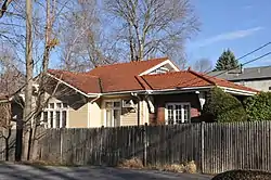 The William L. Church House is a historic house at 145 Warren Street in Newton, Massachusetts. The 1+1⁄2-story wood-frame house was built in 1916, and is one of Newton's finest Bungalow-style homes. It has a tiled hip roof with wide eaves supported by brackets, and there are projecting window bays. The entrance porch also features large brackets, and its posts are set on brick piers. Some of the windows have colored glass panes in the transoms. The house's owner, William Church, was a hydraulic and mechanical engineer.[2] The house was custom built for his niece, pianist Dai Buell and was known as the "Aloha Bungalow".[3] The house was listed on the National Register of Historic Places in 1990.