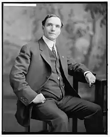 La Follette was a member of the World's Fair Commission and had charge of the Washington State building at the Chicago Exposition in 1893.[11][12] He served as a member of the State House of Representatives from 1899 to 1901.[13] He also served on the School Board and was an active member of the Grange. He was elected as a Republican to the Sixty-second and to the three succeeding Congresses (March 4, 1911 to March 3, 1919). He was active on the House Committee on Public Lands and engaged deeply in land use and water issues. His policy interests reached far beyond the region he represented in the Pacific Northwest. He fought for the passage of bills that brought water to San Francisco[14] and the creation of the National Park Service.[15] He joined with his cousin, Robert M. La Follette in opposing President Woodrow Wilson's foreign policy decisions, and like his cousin voted against declaring war on Germany. For much of the time he was in Congress, the two LaFollette families shared a large house that he had purchased in Mount Pleasant, Washington D.C.[16] The house became a center for debate and discussions of the great issues of the day as a steady stream of politicians, policy makers, academics, artists and labor and business leaders debated late into the night.[17] In 1918 he ran unsuccessfully for renomination in the Republican primary.