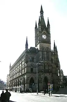 Lockwood and Mawson were very busy during this period and designed many prominent buildings in Bradford including Bradford City Hall in open competition[22] and the Wool Exchange also in open competition. The City Hall opened in 1873. Its most notable feature is the magnificent clock tower which is Italianate inspired by the Palazzo Vecchio in Florence.[23] The Wool Exchange was built between 1864 and 1867 with the foundation being laid by the Prime Minister of the day, Lord Palmerston.[24] It was designed in ornate Venetian Gothic style. Both Bradford City Hall[25] and Wool Exchange[26] are Grade I listed buildings.