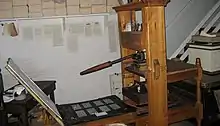 Parks established a print shop in Colonial Williamsburg near the Capitol building on the main street known as the Duke of Gloucester.[4][19] It was the first permanent printing establishment in the colonies and kept the surrounding colonies informed on the latest news. In addition to the Gazette, Parks printed books, pamphlets and tracts. Surviving examples of his work show that his first publications were printed with Dutch type, but were eventually replaced with a better type forged in England by William Caslon.[20][21] While in Williamsburg Parks printed The Laws of Virginia in 1729 for the government of the Virginia colony, along with a work about the history of Virginia.[18][22] During this time he was printing for both the Virginia and Maryland colonial governments, but later ended his service for Maryland in 1733.[22] Later he moved to the print shop familiar today as the tourist attraction on lot 48.[4] It is a two-story building and served as Virginia's post office and Williamsburg's bookshop, stationery store, and book bindery. The Parks family lived above the shop for their home.[23]