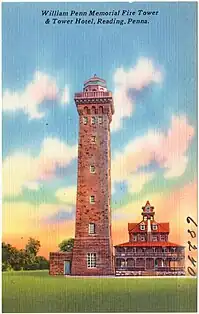 The William Penn Memorial Fire Tower is a fire lookout tower located on Mount Penn in Lower Alsace Township, Berks County, Pennsylvania, U.S. Named after William Penn, the structure is owned by the city government of nearby Reading, Pennsylvania, which the tower overlooks. Work on the structure began in late 1938 as a project of the Works Progress Administration (WPA), with the tower completed the following year. The tower remained in regular use, both as a tourist attraction and as a legitimate lookout tower, for the next several decades, although deterioration to the building caused it to be closed in 1988. Starting in the late 1990s, a local nonprofit group began working to restore the tower, and it was reopened in 2004. The tower is listed on the National Historic Lookout Register, having been added in 1999.