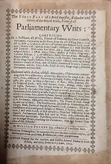 - William Prynne (1659). The first part of a brief register, kalendar and survey of the several kinds, forms of all parliamentary vvrits: comprising in 3. sections, all writs, forms of summons to great councils, parliaments, convocations in the Tower, from the 5th of King John (1203) till 23 Edw 4. (1483) to all sorts of spiritual and temporal Lords, greatmen (members of,) and the Kings council (assistants to) the House of Lords: with other rare writs, and 4. exact alphabetical, chronological tables: 1. Of all abbots, priors, masters of orders, clergy-men, (except bishops:) 2. Of all dukes, earls, forreign kings, marquesses, princes of Wales: 3. Of all lay-barons, lords, vicounts, great men: 4. Of all the Kings council (justices, clerks, or other officers) with the several numbers of each of them, and of bishops, summoned to every council, parliament, and the years, rolls, dorses in every kings reign, wherein their names are recorded. Illustrated with choice, usefull annotations, observations concerning these writs differences, alterations, entries in the clause rolls: the stiles, titles, additions of patriarcha, cardinalis, electus, confirmatus, magister, &c given in them to spiritual; ... With other particulars. Publishing more rarities, rectifying more errors in vulgar writers, touching our parliaments, than any former treatises of this subject. By William Prynne Esq; a bencher of Lincolnes Inne (1st ed.). London: Printed for the author, and sold by Edward Thomas in Little Britain, and Henry Brome in Ivy-Lane. OCLC 83751432.