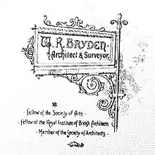 Bryden was an articled architect with Edward Middleton Barry RA and trained under Robert William Edis RSA and William Henry Crossland. He became an Associate of the Royal Institute of British Architects (RIBA) in 1876. In 1877 he established the architect and surveyor practice of "Bedborough and Bryden" at Bideford and Westward Ho in Devon.[1] Bryden announced in the London Gazette in 1878 that he had dissolved his partnership with Alfred Bedborough.[5]