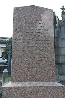 William Williams died on 26 April 1865, after falling from his horse in Hyde Park, London.[2] He is buried in Kensal Green Cemetery, London, in a grave north-east of the main chapel, alongside his parliamentary friend Joseph Hume. A plaque is dedicated to him in the village school he founded in Llanpumsaint.