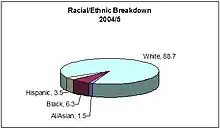 As of the latest reporting (SY-2004/5) the racial/ethnic breakdown for district students is: 1.5% American Indian/Asian/Pacific Islander; 6.3% Black; 3.5% Hispanic; and 88.7% White (non-Hispanic).