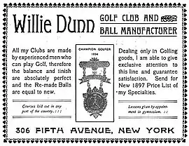 William Dunn, Jr. (c. 1864 – August 1952)[1] was an English professional golfer and golf course designer of Scottish descent. Dunn was born in Blackheath, London, England in about 1864. His best U.S. Open finish was second in the 1895 U.S. Open.[2] He took home $100 as his share of the purse.[3] His best known golf course designs are those found at the Shinnecock Hills Golf Club and the Apawamis Club.[4]