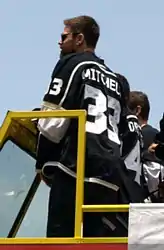 Mitchell began the season on a defensive pairing with Drew Doughty.[60] Nearly a month into the campaign, he notched his first goal as a King, scoring short handed against the Dallas Stars in a 5–2 victory on October 28, 2010.[61] In November 2010, he sustained a wrist injury during a game against the Nashville Predators,[60] sidelining him for 12 games.[56] After recovering, he suffered a knee injury, keeping him from another 11 games.[56] Later in the season, during a game against the Phoenix Coyotes, on March 3, 2011, Mitchell was hit in the face by a shot from opposing forward Kyle Turris, requiring 53 stitches.[56] He did not miss any additional games, however. Mitchell finished the season with five goals and five assists over 57 games, ranking third in average ice time per contest with the Kings. He added a goal and an assist in six playoff games as the Kings were eliminated by the San Jose Sharks in the first round. On February 24, 2012, Mitchell signed a two-year contract extension with the Kings. In the 2012 playoffs, Mitchell helped the Kings defeat the Vancouver Canucks in the first round, the St. Louis Blues in the semi-finals (winning four games straight) and the Phoenix Coyotes in the Conference Finals. The Kings made the Stanley Cup Finals for the first time since 1993 and defeated the New Jersey Devils; this also marked Mitchell's first appearance in the Stanley Cup Finals. Mitchell was the second player, after team captain Dustin Brown, to hoist the Cup after the win.