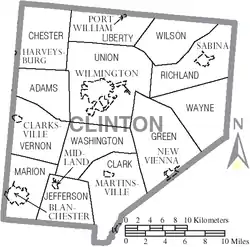 Clinton County is a county located in the U.S. state of Ohio. As of the 2020 census, the population was 42,018.[2] Its county seat and largest city is Wilmington.[3] The county is named for former U.S. Vice President George Clinton.[4] Clinton County comprises the Wilmington, Ohio Micropolitan Statistical Area, which is also included in the Cincinnati-Wilmington-Maysville, OH-KY-IN Combined Statistical Area.