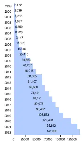 As of January 2023, the total installed wind power nameplate generating capacity in the United States was 141,300 megawatts (MW).[4] This capacity is exceeded only by China and the European Union.[5] Thus far, wind power's largest growth in capacity was in 2020, when 16,913 MW of wind power was installed.[6] Following behind it were 2021, during which 13,365 MW were installed, and 2012, which saw the addition of 11,895 MW, representing 26.5% of the new power capacity installed during that year.[1]