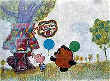 Winnie-the-Pooh (Russian: Винни-Пух, romanized: Vinni-Pukh, IPA: [ˈvʲinʲːɪ ˈpux] ⓘ) is a 1969 Soviet animated film by Soyuzmultfilm directed by Fyodor Khitruk.[2] The film is based on chapter one in the book series by A. A. Milne. It is the first part of a trilogy,[3] along with two sequels: Winnie-the-Pooh Pays a Visit (Винни-Пух идёт в гости, 1971) and Winnie-the-Pooh and a Busy Day (Винни-Пух и день забот, 1972).[1]