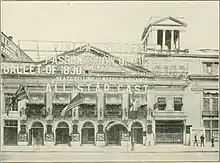 As designed, the main entrance was on Broadway and there were ten exits on Seventh Avenue.[4][18] The Broadway facade was designed in a colonial style with plain gray stone.[18][19][20] The original exterior used much of the existing facade of the Horse Exchange, though a cupola was added in the modification, as well as a heavy cornice.[20] The facade had five Palladian-style arches and columns.[19][21] The columns rose two stories, supporting a cornice and a pediment.[21] Five mahogany doors led to the ticket lobby.[18] The modern facade has large billboards, which have historically been used to advertise the shows at the Winter Garden.[22] The billboards date to at least the 1930s.[6]