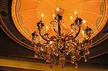The modern ceiling contains vaults, placed between ribs that are designed in the Adam style. The vaults themselves are divided into panels by Adam-style moldings and bands. The center of the ceiling contains a panel with a dome, surrounded by latticework and foliate decoration. At each of the dome's four corners, there are medallions, which depict mythical fauns playing lyres and pipes.[38] In the theater's original design, the ceiling trusses remained exposed, a vestige of the old Horse Exchange.[7][15][21] The ceiling was finished in wooden latticework, and the ceiling was painted blue, giving an impression of an open-air venue.[14][18][44] The original ceiling had poor acoustics.[20] During the 1922 renovation, Krapp had lowered the ceiling to below the trusses.[15][34][41]