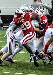 The Badgers started out the 2014 season ranked No. 14 in the AP Poll and their season opener was against No. 13 LSU Tigers in Houston, after leading the Tigers through three quarters the Tigers came back from a 24–7 deficit to defeat the Badgers 28–24.[5] The Badgers recorded their first road shutout since 1998 in a 37–0 victory over the Big Ten newcomers Rutgers Scarlet Knights.[6] On November 15, junior running back Melvin Gordon broke the all-time FBS single-game rushing yards record with 408 yards in a 59–24 victory against the Nebraska Cornhuskers.[7] However that record only lasted a week as Samaje Perine from Oklahoma rushed for 427 yards the very next week. The 2014 regular season ended with the Badgers taking 1st place in the West Division with a 10–2 record. Wisconsin played Ohio State for the conference title in the 2014 Big Ten Championship Game where the Badgers lost to Ohio State 59–0. It was the first time since 1997 that the Badgers were shutout and the worst loss since 1979 when Ohio State defeated the Badgers 59–0.[8]