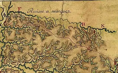 The Wolf River's watershed (everything above the red dotted line), as surveyed in 1740 by Ignace Francois Broutin, chief engineer of French Louisiana. The French had named the Wolf "Riviere a Margot" - 1977 Mary Winslow Chapman publishes I Remember Raleigh, which including vivid descriptions of a pre-channelized Wolf River (early-to-middle 20th century).
