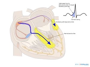 The cause of WPW is typically unknown and is likely due to a combination of chance and genetic factors.[2] A small number of cases are due to a mutation of the PRKAG2 gene which may be inherited in an autosomal dominant fashion.[2] The underlying mechanism involves an accessory electrical conduction pathway between the atria and the ventricles.[1] It is associated with other conditions such as Ebstein anomaly and hypokalemic periodic paralysis.[1] The diagnosis of WPW occurs with a combination of palpitations and when an electrocardiogram (ECG) show a short PR interval and a delta wave.[3] It is a type of pre-excitation syndrome.[3]