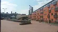 Several other structures associated with the station are listed buildings. A tall, blue-brick retaining wall and subway lead beneath the High Level tracks to the station, originally built as a shortcut between the two stations and known as "the colonnades". The brickwork on the interior is glazed white, and has decorative iron railings mounted to it The wall and subway form a grade II listed building.[1][4] Due to the construction of the replacement High Level Station, the colonnades and subway were closed temporarily and as of December 2021, remain closed.