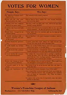 Following the disappointment of the Maston-McKinley Partial Suffrage Act, the WFL of Indiana refocused their efforts to join forces with the National American Woman Suffrage Association in seeking a federal amendment granting suffrage for women. The WFL of Indiana would undergo a movement utilizing pamphlets, organizing women and performing marches in the United States. The WFL would also argue the social and working conditions created by World War I enabled women to voice their opinions to a different audience.[7] In a pamphlet named "Votes For Women! The Woman's Reason" some of the reasons listed for women to vote were, "Women must obey the laws just as men do, they should vote equally with men", "Women are consumers, and consumers need fuller representation in politics", and "Women are citizens of the government OF the people, BY the people and FOR the people, AND WOMEN ARE PEOPLE".[7] This new direction, taken during the era of World War I, led to newfound success and membership growth.