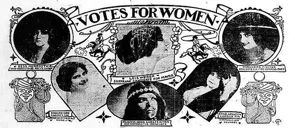 Florence Lawrence participated in the Woman suffrage parade of 1913 on horseback, where she was filmed in Kinemacolor.[11] Screenwriter Frances Marion participated in the October 23, 1915 parade that brought more than 30,000 supporters of women's suffrage onto the streets of New York City.[34] Actress Fan Bourke opened The Princess, a 500-seat "votes for women" movie theatre, in New Rochelle, New York in late 1915.[11]