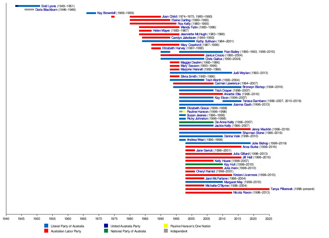 | 1 | Dame Enid Lyons | UAP, Liberal | Darwin (Tas.) | 21 August 1943 – 19 March 1951 (retired) |