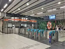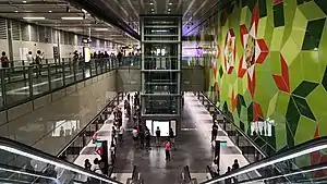 Commissioned as part of the Art-in-Transit programme, Kng Mian Tze's 3652 + 50 is displayed at this station. Consisting of geometric shapes arranged in a Penrose design,[23] the symbols and messages in the artwork were written by 50 individuals as part of the artist's engagement with the local community.[24] These messages and symbols were promises set by the volunteers in 2013 to work on for the subsequent 10 years. It was expected that by the time the station opened, the participants have moved on to a different stage of life.[21]