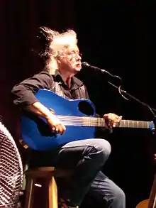 The festival, which over the years has morphed into being called "WoodyFest" by attendees,[1] was founded in 1998 and the inaugural festival included performances by Guthrie's son Arlo Guthrie, British folk-punk-rock artist Billy Bragg, Ellis Paul, Jimmy LaFave, Joel Rafael, and The Red Dirt Rangers.[3][4] For the festival's founding, the Woody Guthrie Coalition commissioned a local Creek Indian sculptor to cast a full-body bronze statue of Guthrie and his guitar, complete with the guitar's well-known inscription: "This machine kills fascists".[4] The statue, sculpted by artist Dan Brook, stands along Okemah's main street - named Broadway - in the heart of downtown Okemah.[5]