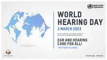 World Hearing Day is a campaign held each year by Office of Prevention of Blindness and Deafness of the World Health Organization (WHO). Activities take place across the globe and an event is hosted at the World Health Organization on March 3. The campaign's objectives are to share information and promote actions towards the prevention of hearing loss and improved hearing care. The first event was held in 2007.[1] Before 2016 it was known as International Ear Care Day.[2] Each year, the WHO selects a theme, develops educational materials, and makes these freely available in several languages. It also coordinates and reports on events around the globe. Individuals and communities involved in hearing care are encouraged to organize activities to raise awareness about the importance of ear and hearing care and encourage them to seek services.