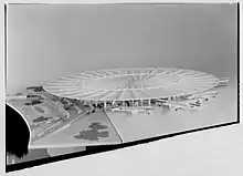 The terminal was originally known as the "Pan Am Terminal" or Pan Am "Unit Terminal Building" (UTB). It was designed by Ives, Turano & Gardner Associated Architects and Walther Prokosch of Tippets-Abbett-McCarthy-Stratton as a showcase for international jet travel and was particularly famous for its 4-acre (1.6 ha) "flying saucer" roof projecting out from the outer columns of the terminal supported on 32 sets of pre-stressed horizontal steel posts and cables. The terminal was designed to allow for aircraft to be parked under the overhanging roof; marketing brochures promoted it as the Jet Age terminal that brought the plane to the passenger. The overhang sheltered passengers as they boarded the aircraft by stairs or by uncovered bridges. The American Institute of Architects (AIA) Guide to New York City called the terminal a "genuine architectural attempt to answer the problem of all-weather connections to the planes" but derided the overall concept as "compromised by an overabundance of distracting detail".[1]
