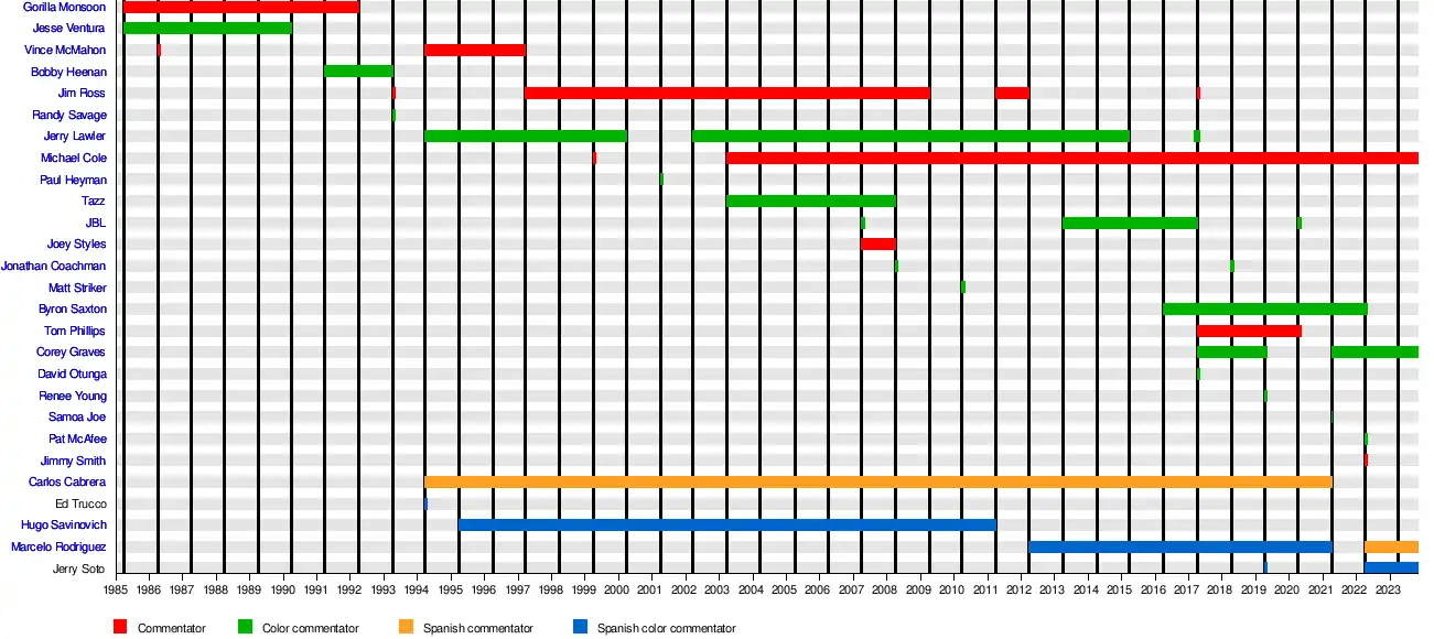 For five of the first six WrestleManias, Gorilla Monsoon and Jesse Ventura served as the color commentators (the exception being WrestleMania 2, which was split among three venues and had Monsoon, Ventura, and Vince McMahon split up with guest commentators), while Bobby Heenan, Gene Okerlund, Lord Alfred Hayes, and others filled guest roles. For WrestleMania VII and VIII, Monsoon and Heenan provided color commentary. In the mid to late 1990s, the commentator team comprised Vince McMahon, Jim Ross, and Jerry Lawler. Since the brand separation in 2002, matches from the Raw brand have been called by Ross and Lawler; the SmackDown matches called by Michael Cole, Tazz, John "Bradshaw" Layfield, and Jonathan Coachman, and from 2006 to 2010, the ECW matches called by Joey Styles and Tazz. At WrestleMania 25, the first three-man inter-brand commentary team since the brand extension was introduced was used and consisted of Jim Ross, Jerry "The King" Lawler, and Michael Cole. The following year at WrestleMania XXVI, Jim Ross was replaced by Matt Striker. At WrestleMania XXVII, Jim Ross returned to commentate, along with Josh Mathews and new SmackDown color commentator Booker T; the sudden change of commentary was due to a singles match between regular commentators Michael Cole and Lawler. Howard Finkel, who is credited with coming up with the name "WrestleMania" in 1984,[13] has served as the long-standing ring-announcer and has appeared at every event except WrestleMania 33, but since the introduction of the WWE brand extension, Lilian Garcia, Tony Chimel, and Justin Roberts took over as announcers for their respective brand's matches. Four French commentators were at ringside: Jean Brassard and Raymond Rougeau (WrestleMania 13), Phillippe Chéreau, and Christophe Agius (WrestleMania XXX, WrestleMania 31, WrestleMania 32, and WrestleMania 33).