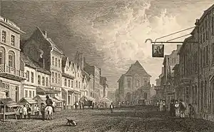 High Street is notable for its grand 18th and 19th century properties of varying scale, colour and detail which were built on long, narrow burgage plots probably of medieval origin.[59] The 18th century façade of the Wynnstay Hotel on Yorke Street closes the vista down the High Street. The hotel is notable as the birthplace of the Football Association of Wales, which was formed at a meeting in the hotel in 1876.[62] The Golden Lion Pub on the High Street is of 16th century origin[60] and became an inn c.1700.[10] The listed Border Brewery chimney towers over Tuttle Street and forms a local landmark in the city centre.