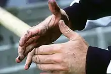 Calluses in the hands are frequently associated with manual labor and blue-collar workers.[14][15][16] During the Gads Hill Train Robbery in 1874, the James–Younger Gang purportedly refrained from robbing men with calloused hands, assuming them to be working class laborers.[17][18] Such notion is also present in Māori culture, where the words raupā and raupo refer to hands left cracked and chapped due to manual work, and are used as similes for someone deemed a hard worker.[19][20]