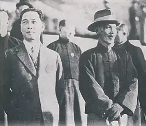 On 1 April 1927, Wang Jingwei returned to China, and arrived at Shanghai, which had been occupied by the National Revolutionary Army. Chiang Kai-shek and Li Zongren met with him to urge him to end the collaborative relations with the CCP as the president of the Wuhan government, but Wang stated that he would "pick up side with the workers and farmers",[37] and proposed to tolerate the communists for the time being. Concurrently, violence broke out in Hankou, part of Wuhan, when trade unionists and communist agitators attacked the Japanese concession there, sparking the "Hankou incident". Wuhan garrison commander Tang Shengzhi and foreign minister Eugene Chen rushed to quell the disorder and assuage the Japanese.[38] At a KMT senior officials' meeting in Shanghai on the following day, Wu Zhihui went so far as to kneel down and beg for Wang's assent to Chiang's proposals.[39] The meeting only managed to proceed with Chiang Kai-shek's and others' mediation. In the fourth Plenary Session of the 2nd KMT Central Committee held in Nanjing, a consensus was reached on how to resolve the KMT-CCP dispute:
