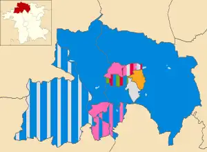 Summary of the council composition after recent council elections, click on the year for full details of each election. Boundary changes took place for the 2004 and 2015 elections, leading to the whole council bring elected in those years.[4][5] The number of councillors was reduced from 42 to 33 for the 2015 election.[2]