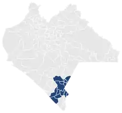 The Eleventh District of Chiapas is in the south of the state, covering a portion of the Soconusco region and the Mexico-Guatemala borderlands. It comprises the municipalities of Amatenango de la Frontera, Bejucal de Ocampo, Cacahoatán, El Porvenir, Huehuetán, Huixtla, La Grandeza, Mazapa de Madero, Mazatán, Motozintla, Siltepec, Tuzantán, Unión Juárez and the extreme north of the municipality of Tapachula.[1]