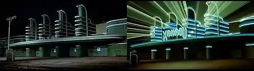 The Pan-Pacific Auditorium in Los Angeles was used for exterior shots of the nightclub. Sonny refers to the venue as "a dump" and the real Pan-Pacific Auditorium had fallen into disrepair. Danny remarks that "they used to have wrestling here", which was indeed true of the Pan-Pacific. The building was destroyed by fire a decade later. Xanadu's nightclub interior was built on Stage 4 of the Hollywood Center Studios beginning in 1979.[6]