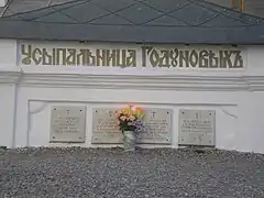Godunov Mausoleum in front of the Cathedral of the Assumption at the Trinity Lavra of St. Sergius where Xenia's name is inscribed on the leftmost plaque as "the Nun Olga Borisovna".