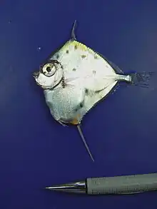 Xenolepidichthys dalgleishi, the spotted tinselfish, is a species of tinselfish found in deep oceanic waters at depths of from 128 to 885 metres (420 to 2,904 ft). This species grows to a length of 15 centimetres (5.9 in) TL. This species is the only known member of its genus.
