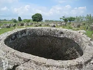 The province's most distinctive landmark is the Plain of Jars. The "jars" are 2,100 tubular-shaped megalithic stone jars used for funerary purposes. The jars range from 1–3 metres (3 ft 3 in – 9 ft 10 in) in height. They are found throughout the province in clusters containing from one to several hundred jars each. The jars date from the Iron Age (500 BCE–500 CE).[20] Nearest to Phonsavan is Jar Site 1, with an area of 25 hectares (ha). The largest jar found here is 2.5 m x 2.5 m, while the rest are half this size. One jar has decorations on it.[19][21] The megalithic jar sites of Xiangkhouang were inscribed on UNESCO's list of World Heritage Sites in July 2019.[20]