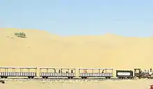 Xiangshawan is in Ordos Prefecture's Dalad Banner,[11] about halfway between Baotou and Ordos City,[12] within the great northern bend of the central stretch of the Yellow River. The Grain of Sand Resort, reception area, and parking lots lie to the east at the edge of Inner Mongolia's reclaimed desert.[13] The rest of Xiangshawan lies at the far eastern corner of the Kubuqi Desert (t 庫布其沙漠, s 库布其沙漠, Kùbùqí Shāmò),[14] which forms the northern half of the Ordos Desert, which itself forms the southwestern portion of the Gobi Desert. The sand is mostly very fine and soft,[4] and the wind-sculpted sand dunes in the resort can reach over 90 meters (300 ft) high.[7]