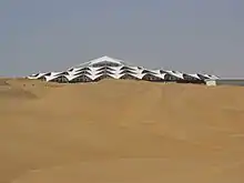 Liansha Island (t 蓮沙島, s 莲沙岛, Liánshādǎo) consists of the Desert Lotus Hotel and its associated outdoor facilities. The 30,000-square-meter (320,000 sq ft) hotel was designed by PLaT Architects.[25] Unable to use traditional foundations, the architects fixed the structure to the fluid sands by using underground steel panels and supports; the hotel thus floats like a boat upon the sands, which stabilize it.[25] Load-bearing walls reduce the pressure transferred to the base.[25] They also employed local materials in the design, using the area's sand to construct its wall covering.[25] The resort has two swimming pools, a basketball court,[35] pool tables, and putting greens.[36] It occasionally holds fireworks displays at night.[36] It employs three large banks of photovoltaic panels for its electricity.[35]