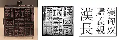 The Yenisei Kyrgyz khagans of the Yenisei Kyrgyz Khaganate claimed descent from the Chinese general Li Ling, grandson of the famous Han dynasty general Li Guang.[104][105][106][107] Li Ling was captured by the Xiongnu and defected in the first century BCE.[108][109] And since the Tang royal Li family also claimed descent from Li Guang, the Kirghiz Khagan was therefore recognized as a member of the Tang Imperial family. This relationship soothed the relationship when Kyrgyz khagan Are (阿熱) invaded Uyghur Khaganate and put Qasar Qaghan to the sword. The news brought to Chang'an by Kyrgyz ambassador Zhuwu Hesu (註吾合素).