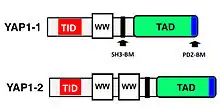 Cloning of the YAP1 gene facilitated the identification of a modular protein domain, known as the WW domain.[8][9][10] Two splice isoforms of the YAP1 gene product were initially identified, named YAP1-1 and YAP1-2, which differed by the presence of an extra 38 amino acids that encoded the WW domain.[11][12] Apart from the WW domain, the modular structure of YAP1 contains a proline-rich region at the very amino terminus, which is followed by a TID (TEAD transcription factor interacting domain).[13] Next, following a single WW domain, which is present in the YAP1-1 isoform, and two WW domains, which are present in the YAP1-2 isoform, there is the SH3-BM (Src Homology 3 binding motif).[5][14] Following the SH3-BM is a TAD (transactivation domain) and a PDZ domain-binding motif (PDZ-BM) (Figure 1).[15][16]