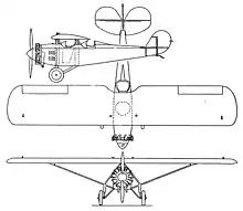 It was powered by a 225 hp (168 kW) Wright Whirlwind J-5 9-cylinder radial mounted in the nose with its cylinders exposed for cooling. The fuselage was flat-sided apart from raised upper decking.[1] Both the cockpits were open, with the two passengers[2] placed side-by-side over the wing with entry via full-depth doors. The pilot sat just aft of the wing trailing edge, where a cut-out provided a wider upper field of view. Baggage or mail was placed in a large hold behind the pilot. Its fuselage tapered rearwards to a cropped-triangular fin with a comma profile, balanced rudder. The tailplane was semi-elliptical in plan and mounted on top of the fuselage, each side braced from below with a strut and a parallel wire and from above with a wire to the fin. Elevators were full and rounded, with a large gap between them for rudder movement.[1]