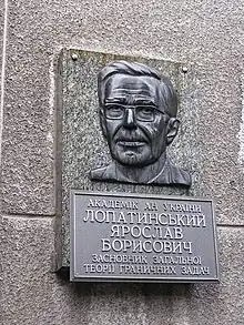 Yaroslav Borysovych Lopatynskyi (1906–1981) was a Soviet mathematician. Born in Tbilisi, Lopatinskii acquired wide acclaim for his contributions to the theory of differential equations. He is especially known for his condition of stability for boundary-value problems in elliptic equations and for initial boundary-value problems in evolution PDEs.