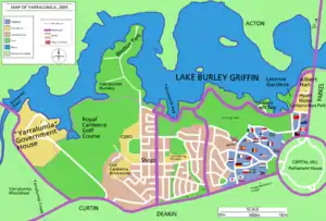 Much of the area of Yarralumla consists of open space or non-residential development, including Weston and Stirling Parks, the Royal Canberra Golf Club, and the grounds of Government House.[2] Many houses are occupied by diplomatic missions.[2] The embassy area of Yarralumla is located towards the eastern end of the suburb next to Stirling Park.[2] It is the hilliest area of Yarralumla. The Parliamentary Triangle is located to its east.[2]