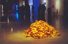 Ağaoğlu has concentrated on art making with performance, visual material and objects.[5] At the beginning her poems, written on yellow paper with a conventional typewriter, occupied the center of these works. The yellow pages are a basic material and modest element of communication with the people, but when they are arranged in huge geometrical heaps in the exhibition spaces they also become a Fluxus installation. Her presence in the exhibition space is considered as performance, even if she does not make a performance in the sense that she is directly involved in the process of the artwork, but her continuous blending into the viewers' attendance gives the impression of a performance. Her approach to art-making is minimalist and modest. Avoiding popularity and sophistication she describes her works as "technically simple but conceptually rich."