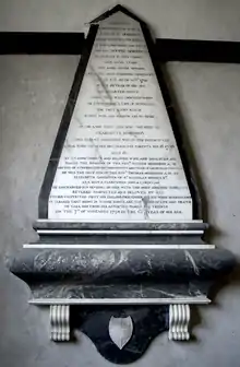 Escutcheon showing hatched arms of Morrison impaling Orchard. Detail from Charlotte Orchard's mural monument.[lower-alpha 2]