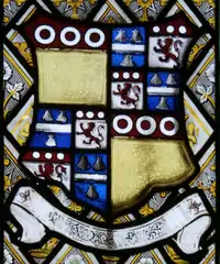 - Robert Giffard (son), who married Radigand (Latinized to Radigunda) Dennis, daughter and sole heiress of Gilbert Dennis of Gidicott (about 9 miles south of Yeo) in the parish of Bradford,[15] Devon, and lord of the manor of Bradford.[16] Gilbert Dennis was the eldest son of Thomas Dennis (by his first wife Alice Bamfield) of Holcombe Burnell in South Devon, himself the son of Walter Dennis of Gidicott. The Dennis family is first recorded in Devon in the 12th century,[17] one branch at Orleigh, about 1 mile south of Yeo, and the other at Gidicott. Both branches had armorials containing three Danish battle-axes, supposedly referring to their Danish origins. The arms of Dennis of Orleigh Azure, three Danish battle-axes or[18] survive in a fragment of ancient stained glass in the Yeo Vale Chapel forming the north transept of Alwington Church. The arms of the Dennis family of Gidicott (whose ancestors were the Giffards of Halsbury[19]) and later of Holcombe Burnell were: Ermine, three Danish battle axes gules.[19]