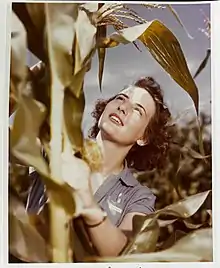 Some of the WAVES recruits celebrated the second anniversary of their organization by de-tasseling seed corn at Reinbeck, Iowa. The WAVES were given permission to spend their liberty hours on two weekends (29-30 July and 5–6 August 1944) as farm emergency workers. They relieved the 14- and 15-year old workers who de-tasseled during the week. Available truck transport limited the number of WAVES volunteers to about 150. A representative of a corn seed company presented a color slide program explaining the life cycle of the corn plant and why de-tasseling is important for production of high-quality seed corn. The sight of WAVES working in the corn fields attracted both the local citizenry as well as the newsreel cameramen. (2015 Krein, p 60–1)