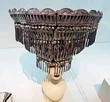 Some historians believe that the majority of the kingdom of Nanzhao were of the Bai people,[10] but that the elite spoke a variant of Nuosu (also called Yi), a Tibeto-Burman language closely related to Burmese.[11] The Cuanman people came to power in Yunnan during Zhuge Liang's Southern Campaign in 225. By the fourth century they had gained control of the region, but they rebelled against the Sui dynasty in 593 and were destroyed by a retaliatory expedition in 602. The Cuan split into two groups known as the Black and White Mywa.[12] The White Mywa (Baiman) tribes, who are considered the predecessors of the Bai people, settled on the fertile land of western Yunnan around the alpine fault lake Erhai. The Black Mywa (Wuman), considered to be predecessors of the Yi people, settled in the mountainous regions of eastern Yunnan. These tribes were called Mengshe (蒙舍), Mengxi (蒙嶲), Langqiong (浪穹), Tengtan (邆賧), Shilang (施浪), and Yuexi (越析). Each tribe was known as a zhao.[13] In academia, the ethnic composition of the Nanzhao kingdom's population has been debated for a century. Chinese scholars tend to favour the theory that the rulers came from the aforementioned Bai or Yi groups, while some non-Chinese scholars subscribed to the theory that the Tai ethnic group was a major component, that later moved south into modern-day Thailand and Laos.[14]