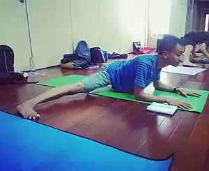 The history of remedial yoga goes back to the pioneers of modern yoga, Krishnamacharya and Iyengar. Iyengar was sickly as a child, and yoga with his brother-in-law Krishnamacharya improved his health; it had also helped his daughter Geeta, so his response to his students' health issues, in Newcombe's view, "was an intense and personal one."[20] In effect Iyengar was treating "remedial yoga" as analogous to Henrik Ling's medical gymnastics.[20] As early as 1940, Iyengar was using yoga as a therapy for common conditions such as sinus problems, backache, and fatigue.[21] Iyengar was willing to push people through pain "to [show] them new possibilities."[22] In the 1960s, he trained a few people such as Diana Clifton and Silva Mehta to deliver this remedial yoga; particular asanas were used for different conditions, and non-remedial Iyengar Yoga teachers were taught to tell students that ordinary classes were not suitable for "serious health issues".[23] Mehta taught a remedial yoga class in the Iyengar Yoga Institute in Maida Vale from its opening in 1984;[24] she contributed "Remedial Programs" for conditions such as arthritis, backache, knee cartilage problems, pregnancy, sciatica, scoliosis and varicose veins in the Mehtas' 1990 book Yoga the Iyengar Way.[25] However, Iyengar was deferential to Western medicine and its assessments, so in Newcombe's view Iyengar Yoga is "positioned as complementary to standard medical treatment rather than as an alternative".[26]